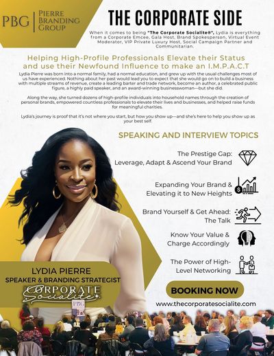 Lydia Pierre, The Corporate Socialite®, is a sought-after Keynote Speaker and Luxury Brand Strategist who transforms how professionals think about success, visibility, and influence. With a career dedicated to helping leaders step out from behind their businesses and into the spotlight, Lydia empowers her audiences to embrace prestige as both a personal and professional strategy. Her signature talks—focused on branding, leadership, and lifestyle elevation—merge powerful storytelling with actionable insights. Whether speaking on “The Prestige Gap” or “The Power of High-Level Networking”, Lydia captivates with sophistication and leaves audiences inspired to rise into their next level of influence, wealth, and impact.